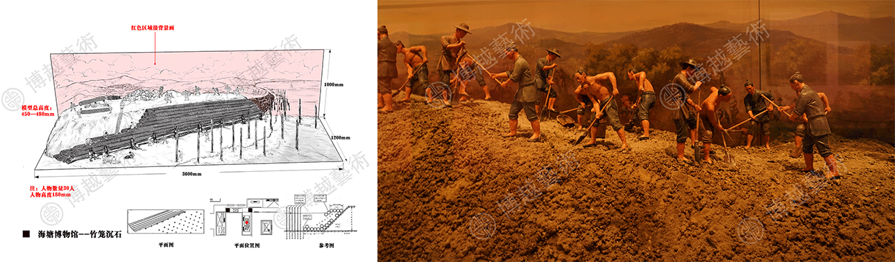 The data research is gradually approaching the end, designers take over the baton of scene creation from the hands of the planners. Unlike other art creations, they will solve a huge problem, that is, how to turn boring cultural knowledge into visual content with aesthetic value. The designers of Boyue have accumulated a great of experience in many previous projects, and have a comprehensive understanding of the basic features of ancient buildings in different times and regions, which makes them well-placed to win. Beyond that, they also carefully studied the relevant materials according to the specific content of the scene, and mastered its characteristics of the times, geographical environment, architectural characteristics, seasonal climate and other details given. For example, the model design of the ancient seawall, based of the scene design combining with the overall spatial layout of the museum, adjusts and guides the visitors' visual focus from a macro perspective, and fully demonstrates the grand momentum of the ancient seawall through a large number of details supported.