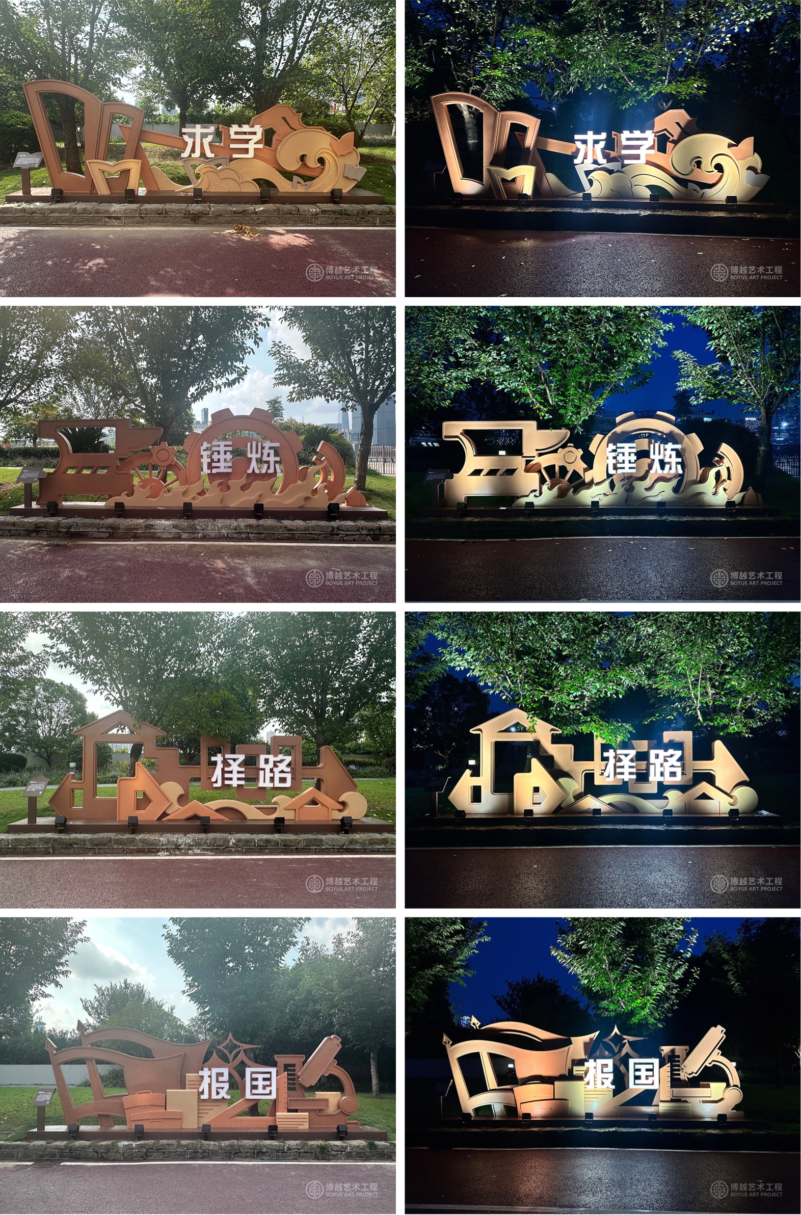 園區門頭以及旗幟、書本、烈焰、齒輪、海浪等多種意象符號,組成藝術景觀裝置。沉穩的鋼結構象徵著歷史的厚重,層疊交錯的結構突顯當代藝術的輕盈與透明,寓意歷史與當下的相互映照。白天它是江畔的取景框,將江景與歷史定格,夜晚則在燈光下化作“時空之門”,邀請人們走進那段熱血歲月。