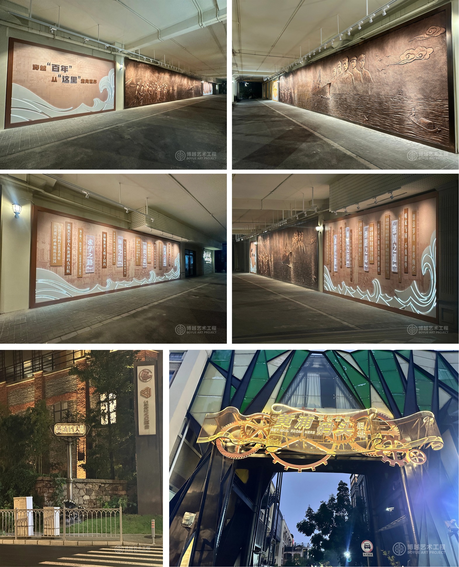 從設計圖紙到實景呈現,是一場“與歷史對話、與細節較真”的匠心修行。我們始終帶著對歷史的敬畏,每一次挖掘、每一次焊接,都是對細節的執著。設計團隊在現場放樣中,反復調整角度、高度,讓藝術裝置精准傳遞“歷史的力量”,實現與自然環境的和諧融入。園區藝術門頭的鏤空雕刻,工匠們選擇逐一打磨細節,以指尖的溫度傳達歷史的生命力。施工搭建中難免遇到挑戰,夏季雨水沖刷著施工場地,團隊冒雨加固材料;十一前的衝刺階段,團隊全員堅守崗位,確保嶄新的黃浦碼頭園區能如期與公眾見面。