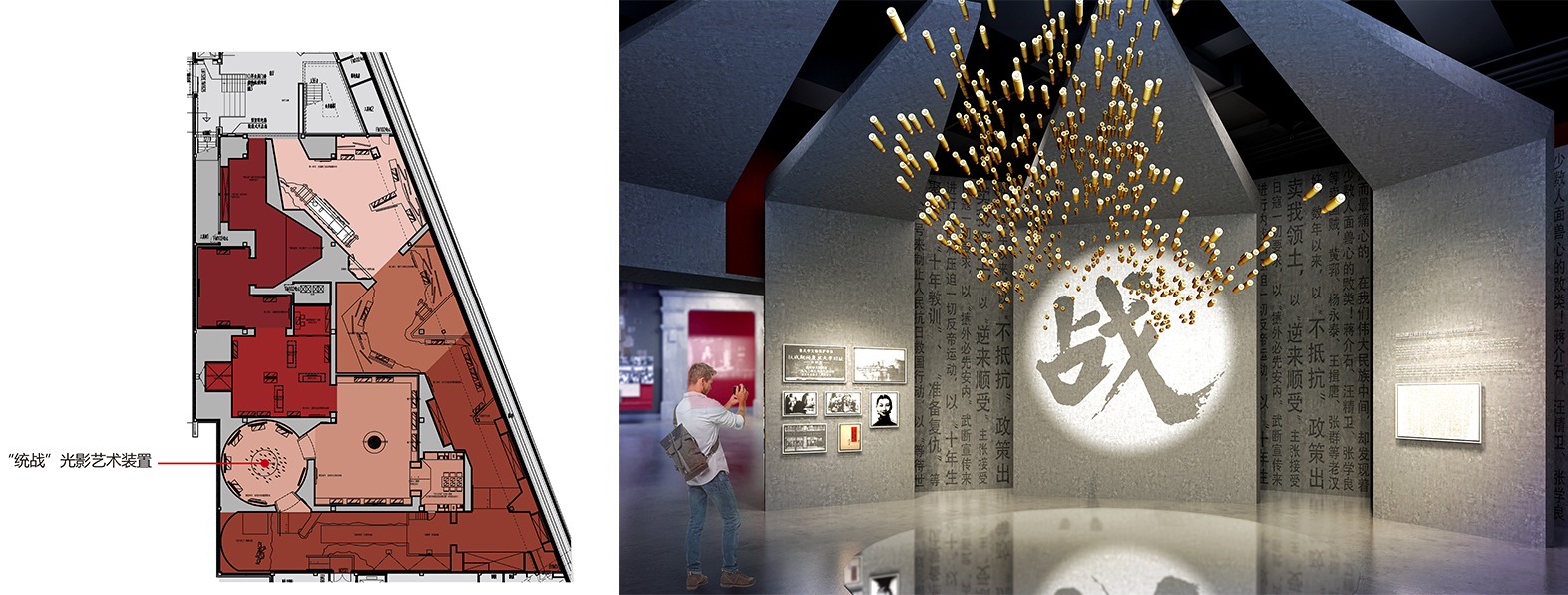 “統戰”光影藝術裝置,位於上海淞滬抗戰紀念館的第四部分——全民族抗戰的重要基地。該展廳以代表團結的“圓”為空間載體,通過聯通到天花板的一體式展牆形成堡壘造型,與抗日民族統戰堡壘互相呼應。展區中央的“統戰”光影藝術裝置以“聚合”為設計理念,運用燈光對物體所在空間中的組合定位進行投射,以“大寫意”的創作手法,虛實結合,彰顯中國人民團結一心、共禦外敵的民族精神與愛國情懷,突顯中國共產黨在抗日戰爭中“中流砥柱”的巨大作用。