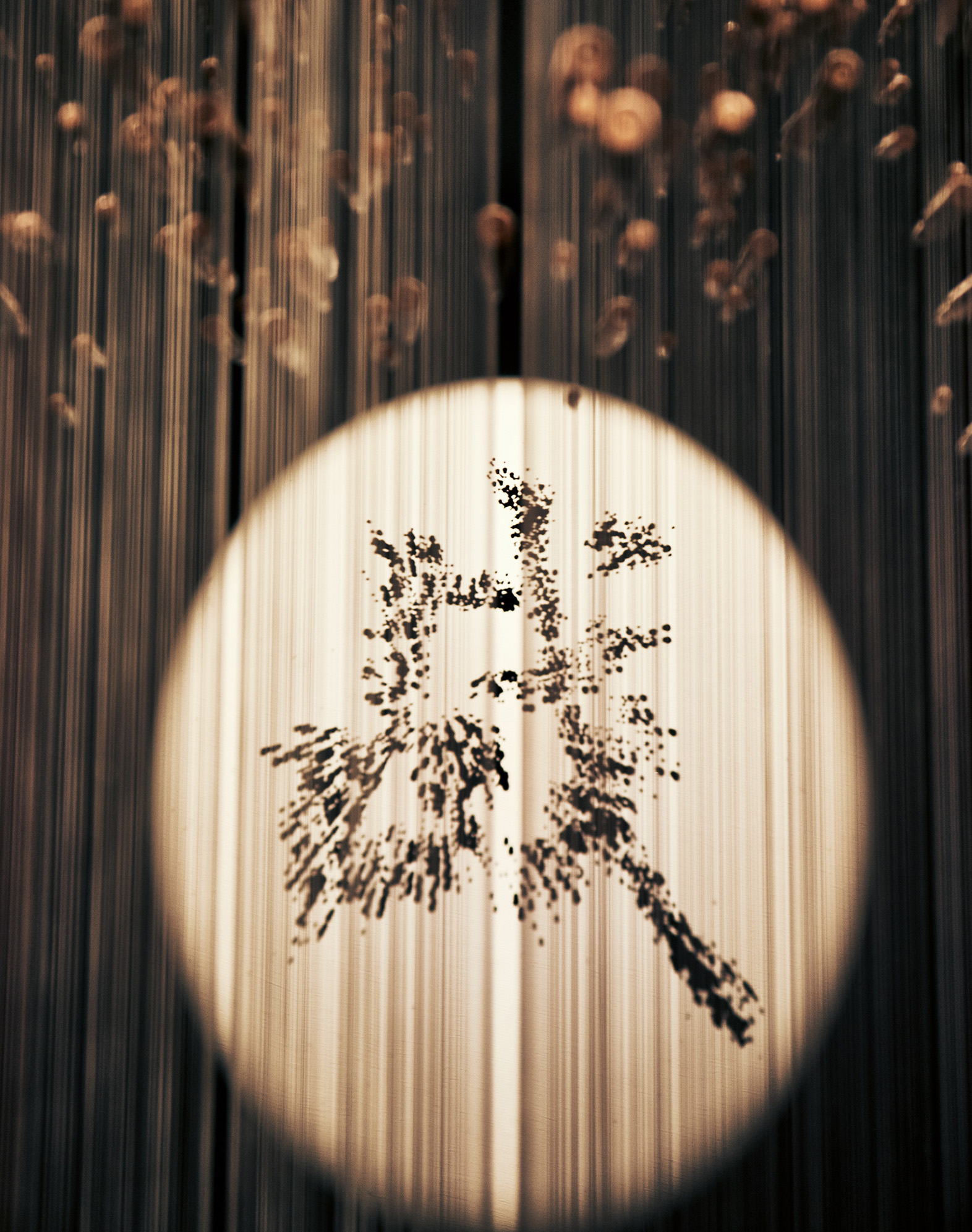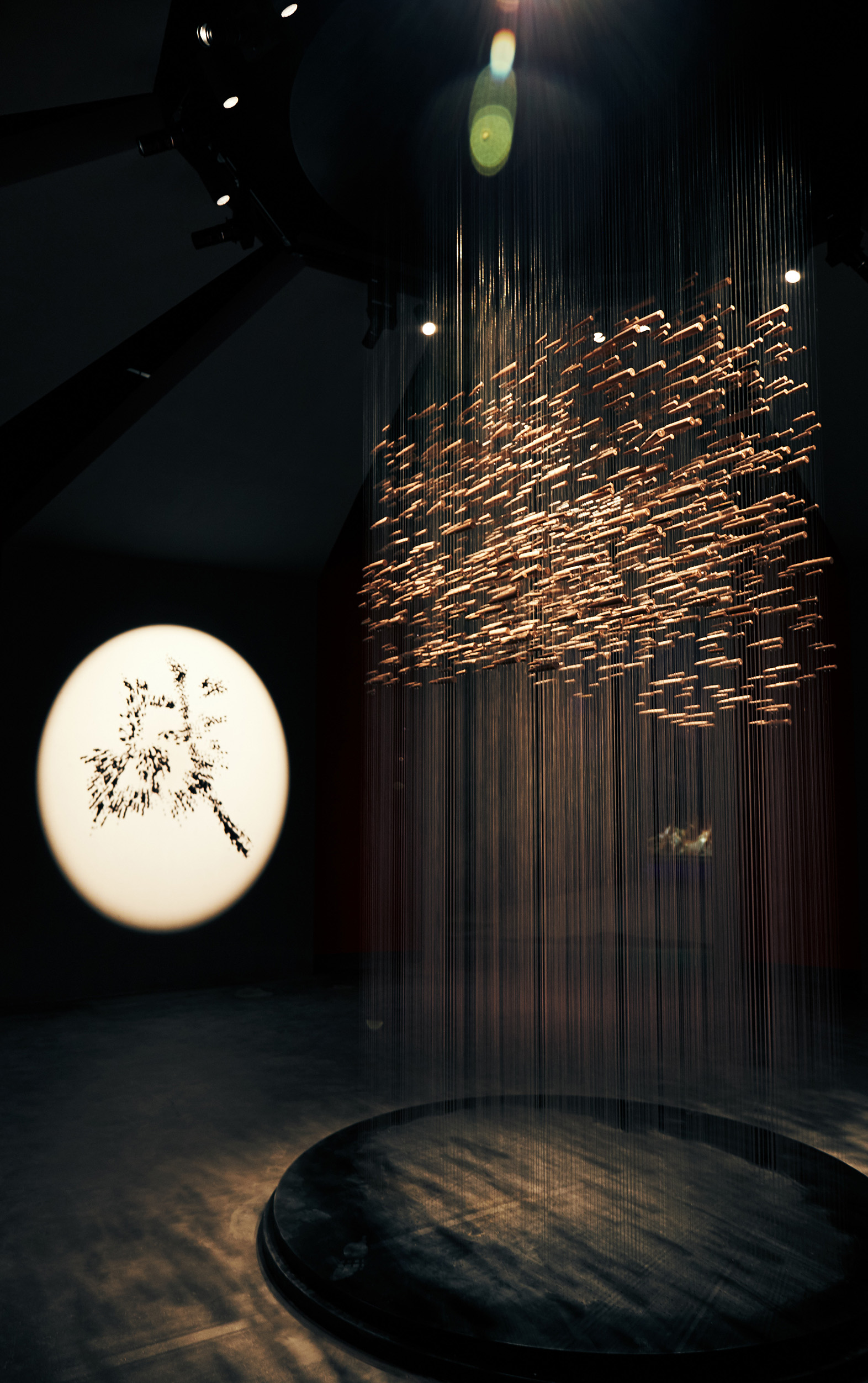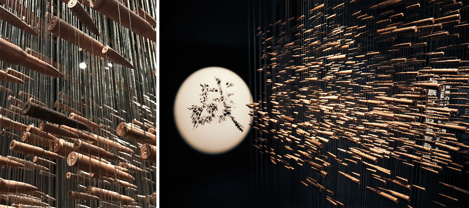 “統戰”光影藝術裝置以代表14年抗戰的1400顆子彈為光影成像的載體,通過代表抗戰勝利的1945根直徑0.5毫米的鋼索予以固定,最終於牆面映射出剛毅遒勁的書法“戰”字。極速飛馳的子彈凝聚在一起,如同面臨民族危機而齊聚一心的千萬中華兒女,爆發出同仇敵愾、克敵制勝的強大精神力量,使藝術裝置更具視覺衝擊力,營造盪氣迴腸、慷慨激昂的展示氛圍。