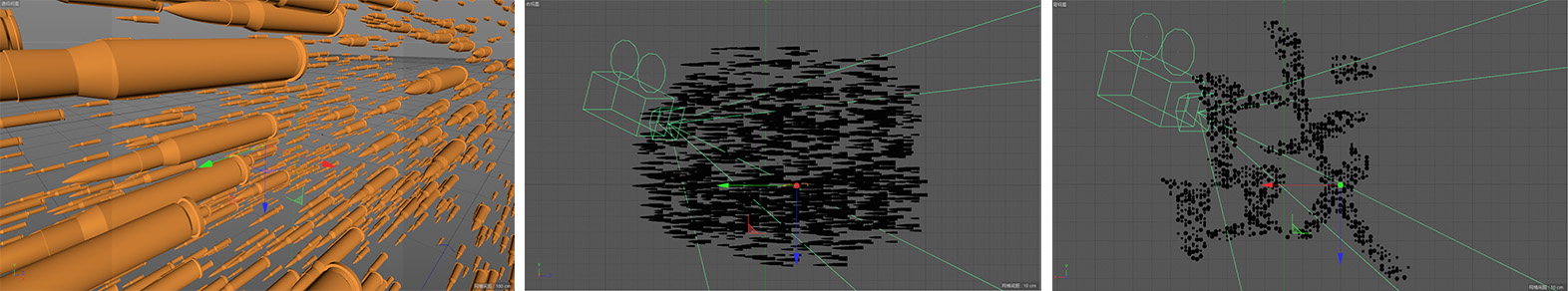 羅馬非一日建成,如此大型且精密的藝術展項,如何落地實現是一直困擾我們的難題。為了精准把控1400顆子彈的空間位置,佈景師與設計師運用三維軟體,逐條分析模擬陣列組合分級,創建結構矩陣,將這1400顆子彈逐級放樣,360度全方位觀測,逐顆調整,確保每顆子彈的空間位置及視覺效果;同時,為了保證光影效果,軟體工程師不斷在數媒空間中模擬不同點位燈光投射,尋找光線來源的最佳角度,確保光影成形的最佳瞬間,並嘗試多層燈光遮罩,提升光影的運用。每個步驟,每個細節,都經過團隊不斷的調試與渲染,從而確保展示效果的真實性與最優化。