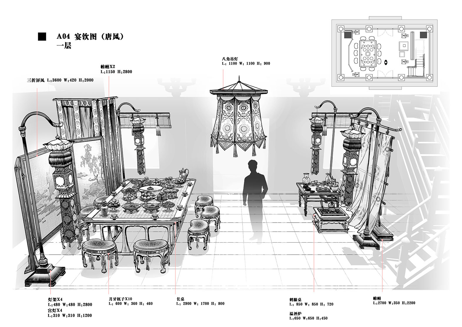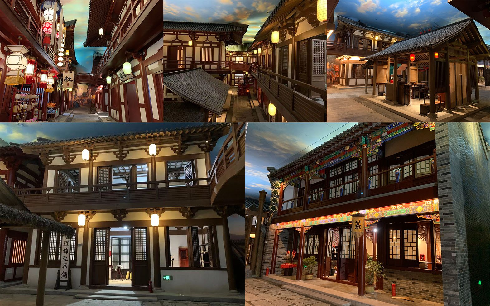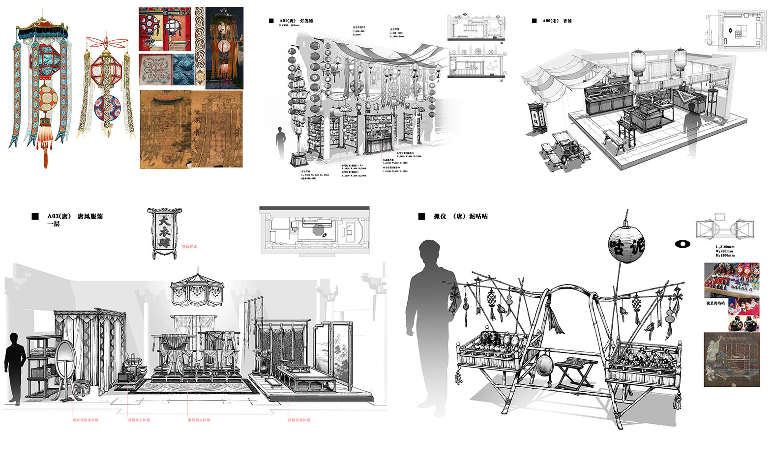 十四個單體建築、數十件大型水利文物、數百件各式各樣的展陳道具……生動且真實的展覽背後,凝聚著設計者的巧思匠心與辛勤汗水。博越藝術團隊的設計師們繪製了數百張古建築、古文物、古器具的設計圖紙。由於時間緊迫、資料有限,設計團隊打破常規,從不同的古畫中搜尋細節與元素。以手繪宴飲圖為例,設計師們參考了《韓熙載夜宴圖》《宮樂圖》《春宴圖》等一系列唐代畫作。他們一邊研究、一邊設計、一邊繪圖、一邊修正,大到仿古建築的結構紋理,小到街邊店鋪裏的桌椅陳設,每個細節都嚴謹真實,每個步驟都精心考究,點滴涓流,匯成汪洋大海。