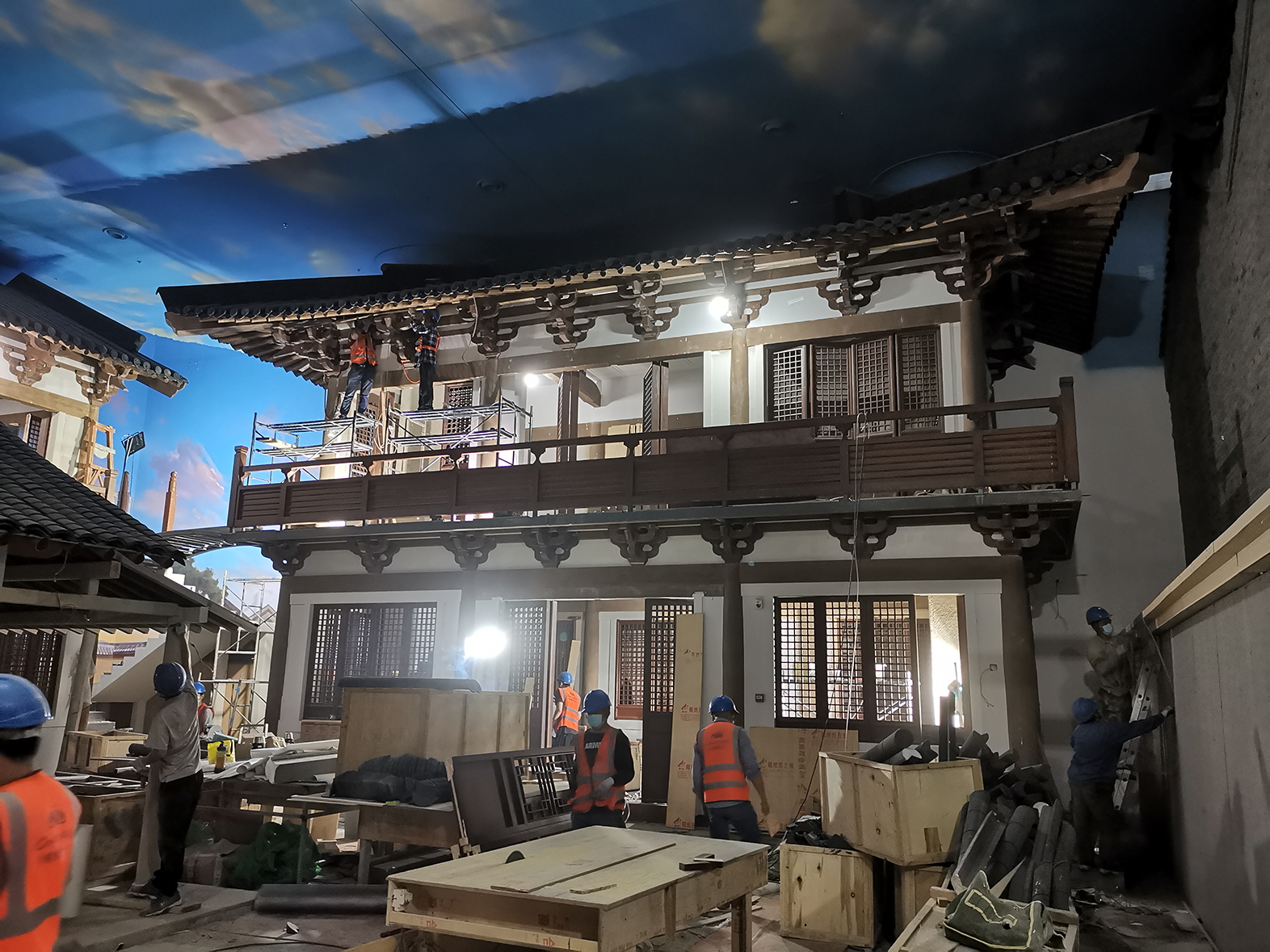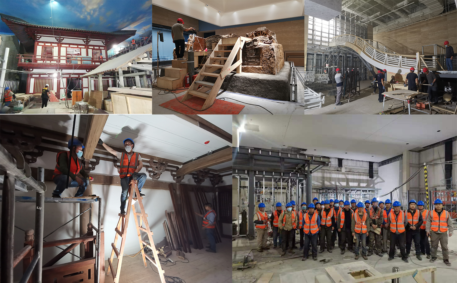 千淘萬漉雖辛苦,吹盡狂沙始到金。博越藝術團隊綜合考慮消防等級、防潮防濕等因素,選取鋼材料搭建骨架,表面則通過打磨、上漆、著色、做舊等藝術處理,還原木質效果,以鋼鐵之軀,重現木質建築的肌理之美。為了克服時間緊迫、施工任務繁重等困難,現場施工人員披星戴月、盡心竭力。焊接、搭建、噴漆、打磨……他們有著頑強的意志和堅定的信念,內心充滿對專案的激情與熱忱,鉚足勁、全身心撲在展陳施工上。團隊還建立了完善的安全組織機構和規章制度,施工現場緊抓安全細節,從小事做起,人人帶好安全帽,系好安全帶,最大程度保障施工安全,防止事故發生。在新冠疫情的陰影籠罩下,專案施工面臨著挑戰與風險,難度也隨之增加。為了保證施工的安全與進度,團隊在做好自身防疫的同時,及時規劃應對方案,把控專案過程中的重要時間節點,提出應急預案與減損策略,保證了專案的正常推進。
