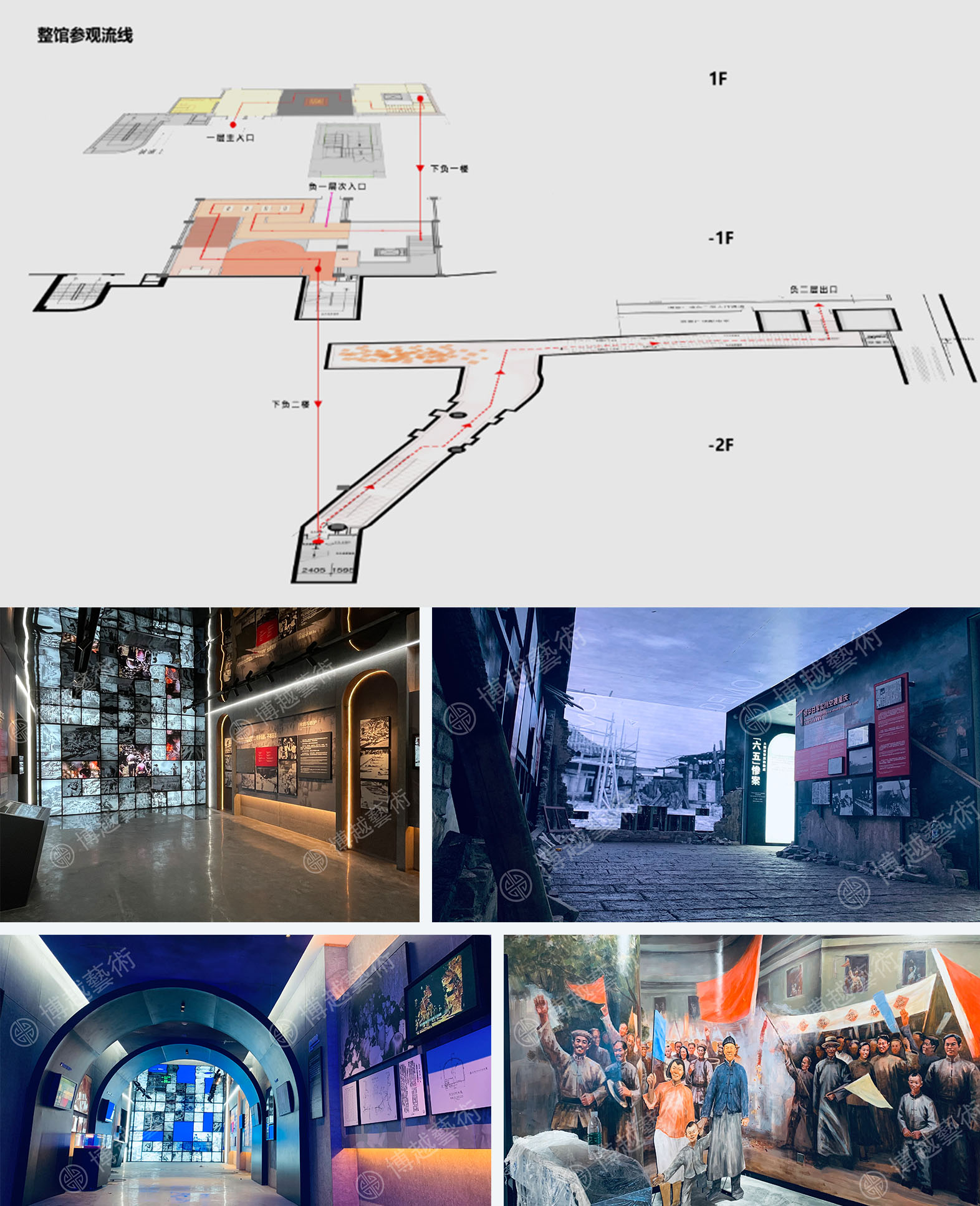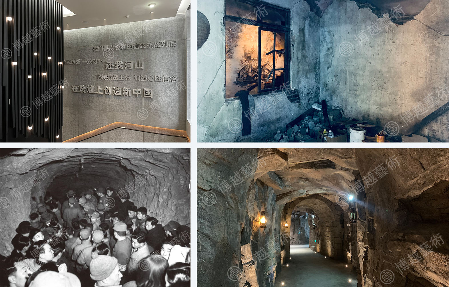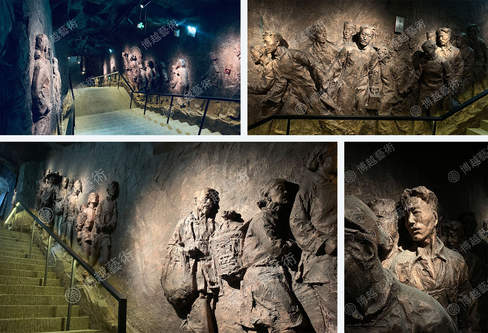 2020年,重慶大轟炸“六五”隧道慘案遺址保護修繕專案以及史實展陳專案正式全面啟動,上海博越藝術工程有限公司(以下簡稱博越藝術)有幸參與其中。在尊重歷史事實、保持遺址整體風貌的大前提下,專案充分利用“六五”隧道慘案遺址的現有空間,將一千多平方米的建築面積合理規劃為三層、兩個區域。其中,一層用於序廳與館標牆展示,負一層用於史實展廳,負二層的隧道洞體則作為“六五”大隧道慘案復原體驗陳列。作為此專案設計與製作的重要一環,博越藝術團隊經過歷史梳理、展陳設計、現場施工等工作,通過場景還原、氛圍營造、藝術塑像等方式,使歷史內容與遺址空間實現了緊密結合,促進了抗戰文化及其精神的保護、傳承與發展。