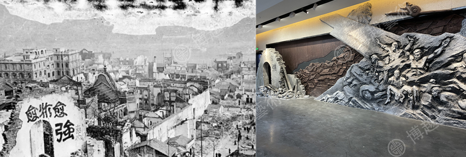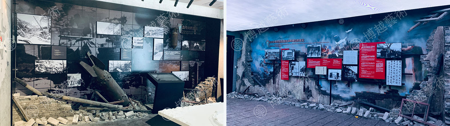 大轟炸後的城市變成了一片廢墟殘垣,但重慶人民卻在敵人的炮火轟炸下,錘煉出鋼鐵般的抗戰精神與民族力量。在重慶大轟炸“六五”慘案史實展的序廳中,博越藝術團隊以大轟炸歷史寫照為元素創作了巨幅浮雕牆,並通過藝術化手法展現了千瘡百孔的城市與堅毅不屈的人民。殘垣斷壁上“愈炸愈強”的標語格外醒目,樹立起一座頑強抗戰的“精神豐碑”。負一層史實展廳團隊則採用了藝術置景、場景還原等多種展示手法,地面堆滿破碎的磚石瓦礫;炸彈與燃燒彈斜插在廢墟之中;一架架日機隱匿在雲霧裏,地獄般的景象,直觀展現了日軍的殘暴行徑,更體現了重慶人民堅韌果敢、自強樂觀的偉大精神。