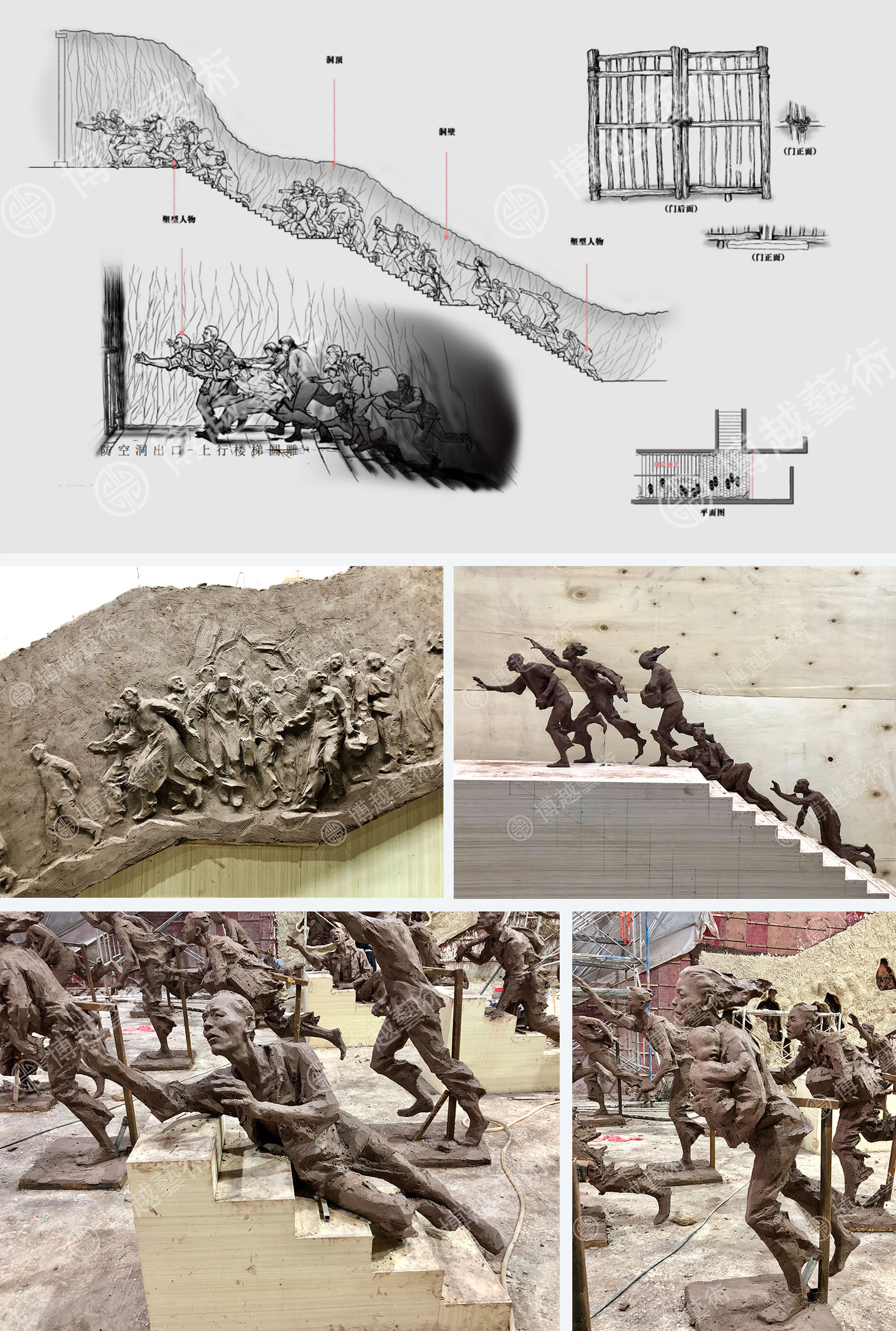 1941年6月5日晚 ,敵機來襲突然且密集,疏散不及的市民紛紛進入較場口隧道內躲避,只能容納幾千人的隧道湧入了近萬人,慘案隨即發生。根據當時的調查認定,重慶大轟炸“六五”慘案死亡人數高達 992 人,傷者近 4000 人,是第二次世界大戰中間接死於轟炸人數最多的一次慘案。如何還原沉痛的歷史,紀念罹難的同胞?博越藝術團隊深入解析這場慘案,在隧道體驗區設計了大量的人物雕像。設計師們充分利用史實資料來還原親歷者原貌,並在創作過程中仔細研究人物特徵、造型特點、職業屬性等,將人物特性與時代背景緊密結合,並通過藝術化的表現手法,既尊重客觀史實,又重視情感渲染,實現了歷史與心靈的對話。團隊設計師與製作人員憑藉對主題的深入理解以及強大的藝術造詣與製作能力,繪製了圖紙,製作了大量的雕塑泥稿。泥稿一出,即得到多方專家的一致認可,因而迅速投入現場製作。
