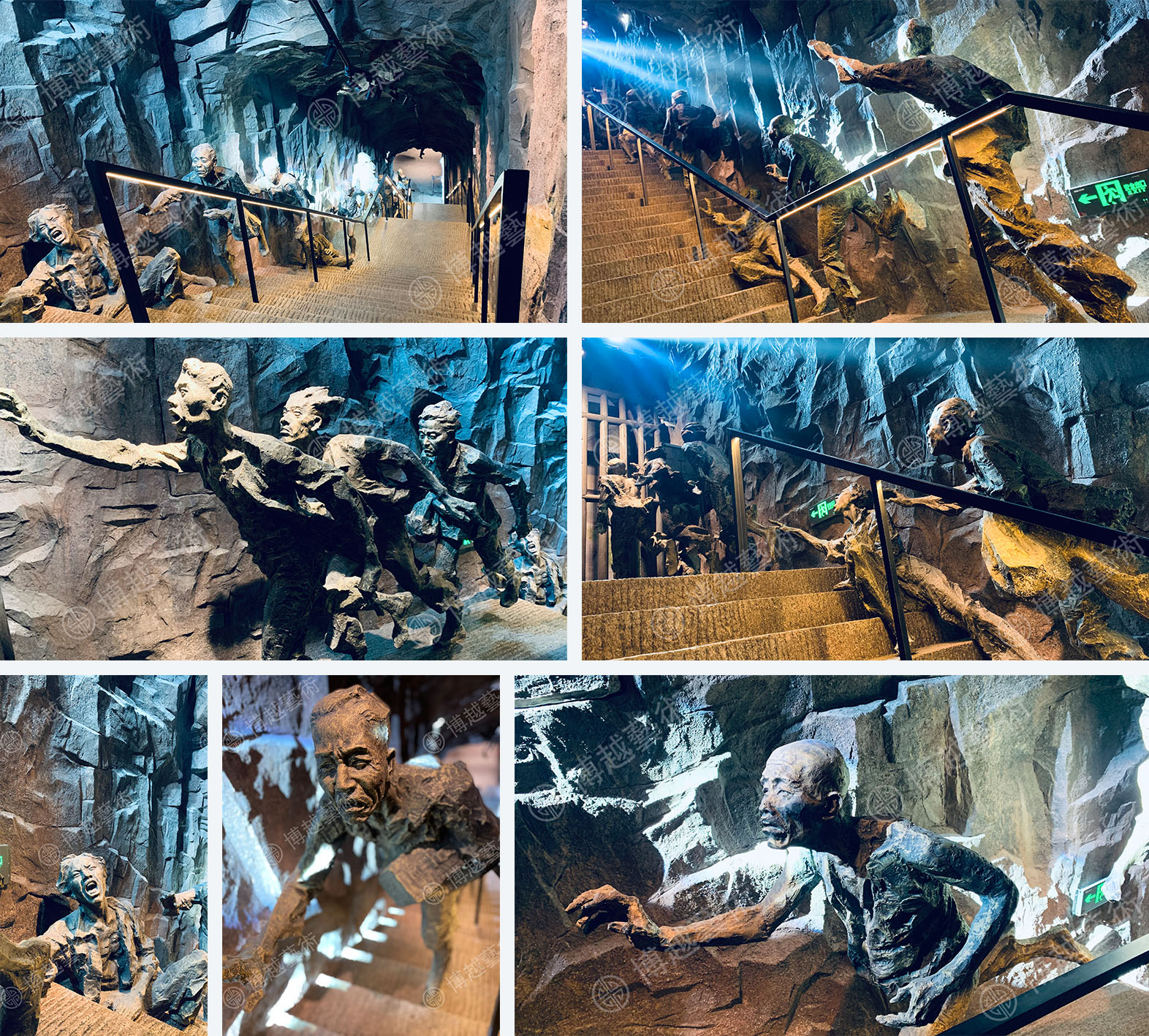 由於日寇轟炸不止,為了安全起見,隧道的各個出口被封鎖。空氣逐漸渾濁,人們開始騷動,慌亂的市民拼命向出口擠去,導致相互踩踏,最終釀成市民窒息身亡的慘劇。樓梯上行兩側,便以艱難求生的避難者為主題,設計了多組人物圓雕。他們有的爬行在階梯上,仰著頭呼吸新鮮空氣;有的步履蹣跚,神情痛苦但充滿對生的渴望;有的高舉右手,向著洞外的陽光匆匆奔去……博越藝術的設計師堅持以形寫神的塑像原則,通過高昂的頭、努力前伸的手、前傾的姿態、奔跑的跨步等肢體動態傳遞情感;並重點對人物頭部的五官、骨點、髮型等進行了細緻刻畫,眉眼靈活深刻、表情栩栩如生,再現了避難者逃亡求生的痛苦與絕望。其次,團隊還賦予了這些雕塑飽滿的體量感與極強的動態張力,人物的組合形態與階梯結構緊密相連,體現了一種由內而外所迸發的力量。這種力量不僅是慘案親歷者對生的渴望,更是體現了重慶人民不畏困難、英勇頑強的抗戰精神。