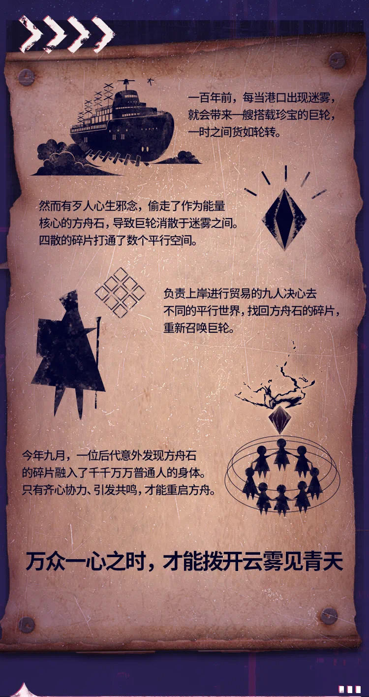 方舟故事以不斷延續蔓延至整個樂園的場景為基礎,通過室內切合年代、細節精緻的佈景道具,綜合光影、聲效等媒體藝術,以及“生活”在各時空內的真人NPC,構建起“虛擬的真實世界”。玩家隨著情節的起承轉合,自然穿梭於不同的時空場景,體驗其時空特色:曲徑通幽神秘莫測的仙境;諜影重重安危難測的十裏洋場;科技感十足的未來時空;時尚奢華一擲千金的大富翁基地;優秀作品群集的藝術館……