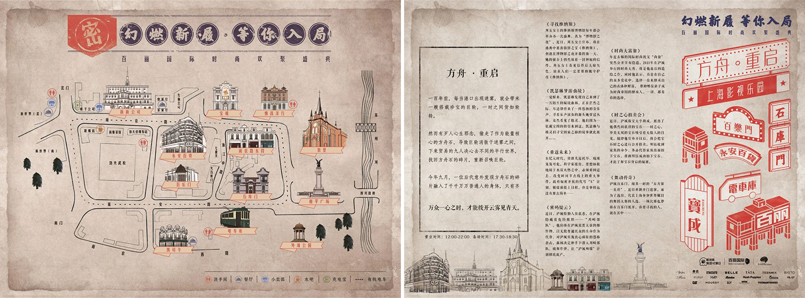 由於時空眾多,《方舟·重啟》充分借助影視樂園的場地特色,綜合運用多種空間組合形式,打破傳統沉浸式密室的場景轉換只在室內進行的模式,將不同主題分散在樂園內各角落,打造“室內”+“室外”的半開放式遊戲空間。百樂門、服裝店、電車庫,皆有可能是劇情的發生地。