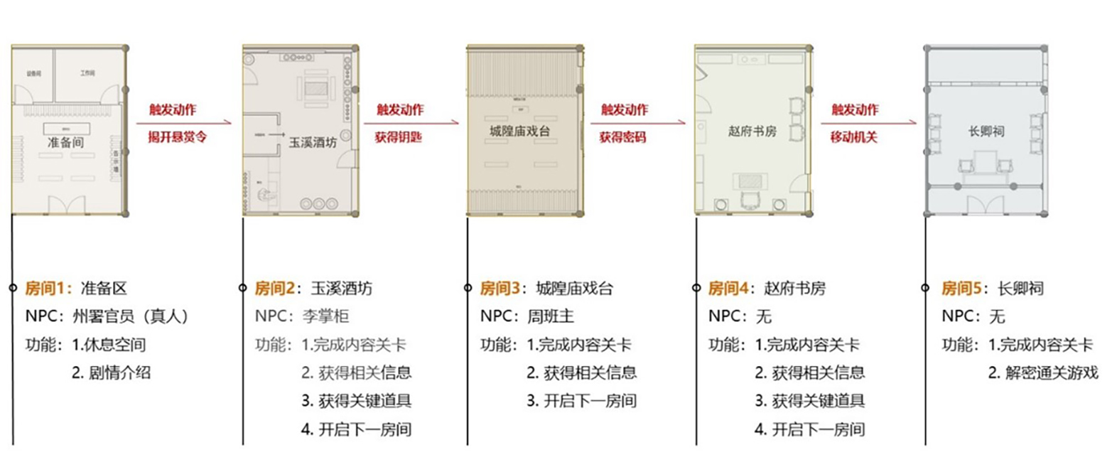 為了避免劇情、空間、解謎策略三者間的割裂感,確保公眾渾然一體的參與體驗,團隊嘗試另闢蹊徑,採取案情推進、空間劃分、文化融合三線並行的創作方式。在合理虛構劇情的同時融入故事相關元素與當地特色文化,並依序規劃四個與故事相關的主題空間:玉溪酒坊、城隍廟戲臺、趙府書房、長卿祠。