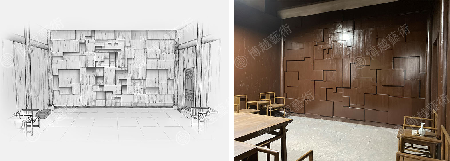機關外側牆面以大小不一、錯落有致的幾何元素進行設計,在多方統籌考慮並確保機關開合的可行性後,內部延續外側的設計風格並以鋸齒疊層增加進深感,確保其動態美觀性;推出的第二重機關則以蓬安地圖為元素進行立體化設計,輔以相如辭賦的立體字,暗示謎題與之相關,彰顯了文化性。