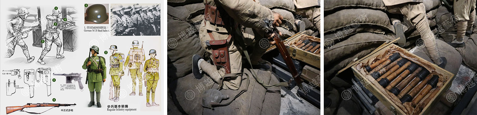 細節是藝術場景的生命與力量。博越藝術團隊在創作初期對史實資料進行了深入研究,把對細節的極致追求,貫穿設計與製作始終。團隊充分考證兵力部署、人員名單、武器裝備等多個細節,真實還原士兵軍裝、鋼盔、中正式步槍、毛瑟手槍、手榴彈等,突顯場景的歷史背景及時代特徵。團隊還充分考慮四行倉庫防禦工事的功能與表現形式,根據多方資料,還原彈藥箱、防禦麻袋、倉庫鐵門等細節,遵循紀念館的真實性原則,以最大程度再現歷史原貌。