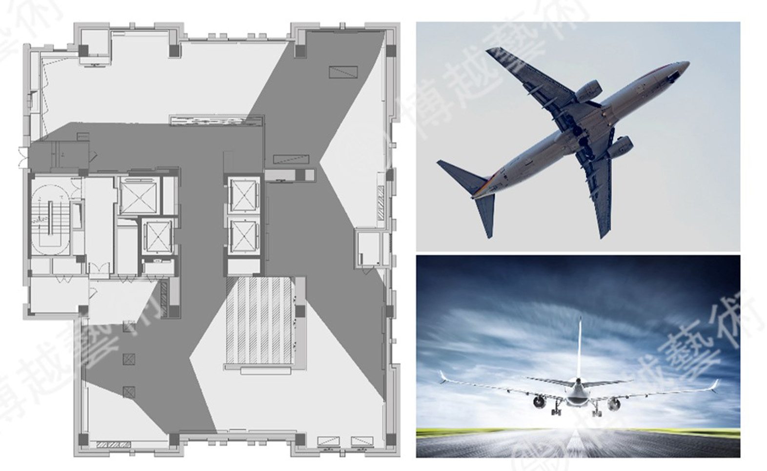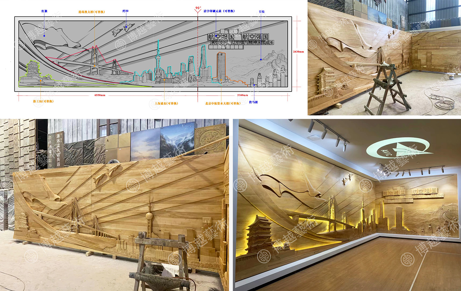 作為展示館的“點睛之筆”,序廳藝術裝置選取了滕王閣、中航資本大廈、東方明珠、殲20等意象符號,以光影紙雕為靈感,運用木質材料創新性設計了可拆卸、可更換的藝術裝置,既滿足了展示的多樣化需求,更突顯了企業的文化價值與內涵。展廳內還大量運用了如飛機、航道等一系列航空元素,既展現了企業特性,更寓意著企業的銳意進取與鯤鵬展翅。